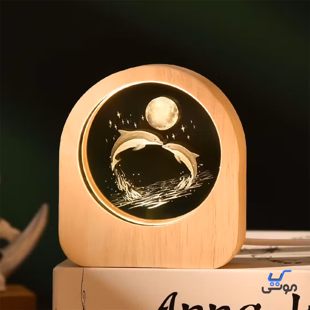 🔸 طراحی هنری و خیرهکننده – تصویری سهبعدی از دلفین و ماه، حک شده روی شیشهی شفاف، وقتی چراغ روشن میشه، نور ملایم تمام جزئیات رو برجستهتر میکنه. 🏝️✨